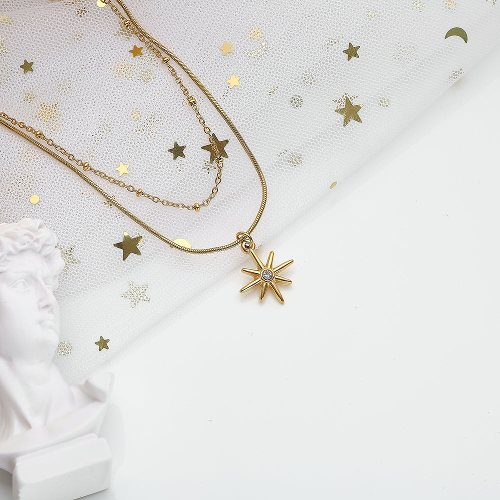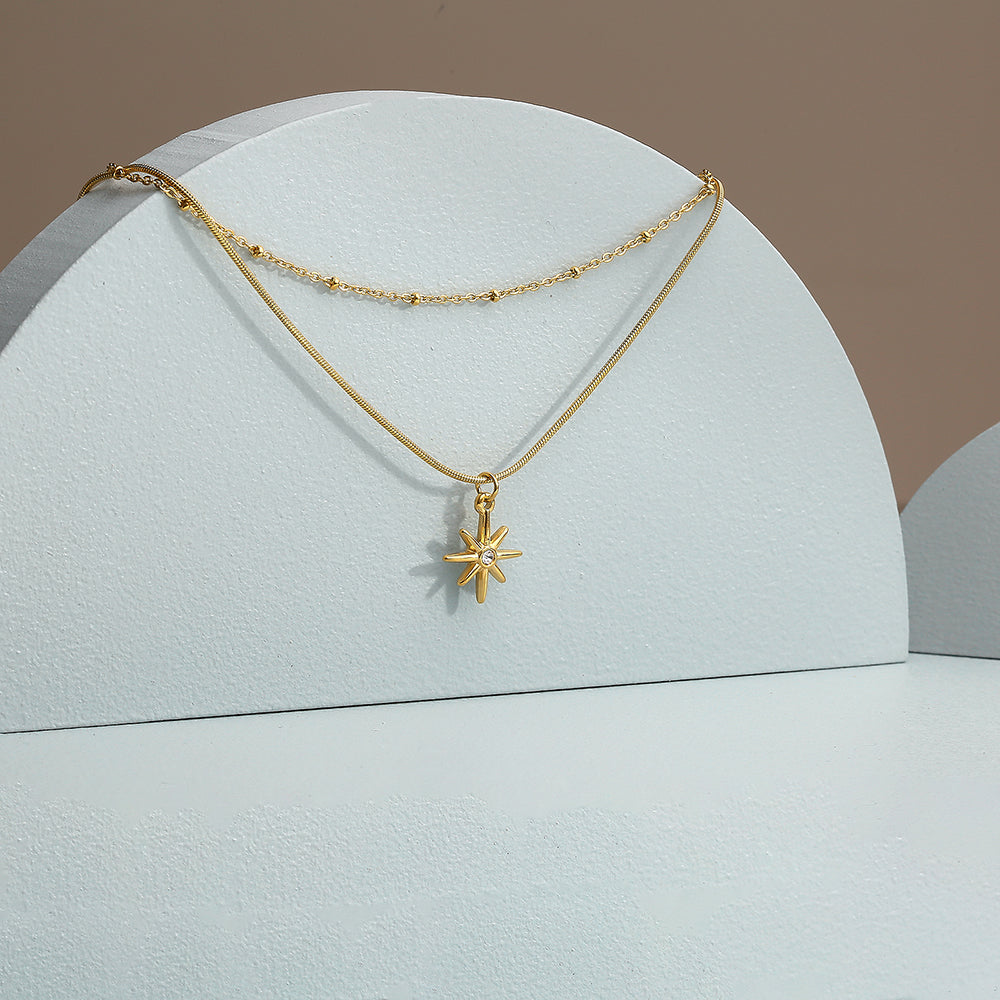 The Celeste Necklace features a dual chain design: one adorned with spaced gold beads for soft texture, and the other with a dainty star charm that adds a hint of celestial magic. Finished in 18k gold plating, this piece blends minimal elegance with a touch of shine — perfect for layering or wearing solo.
